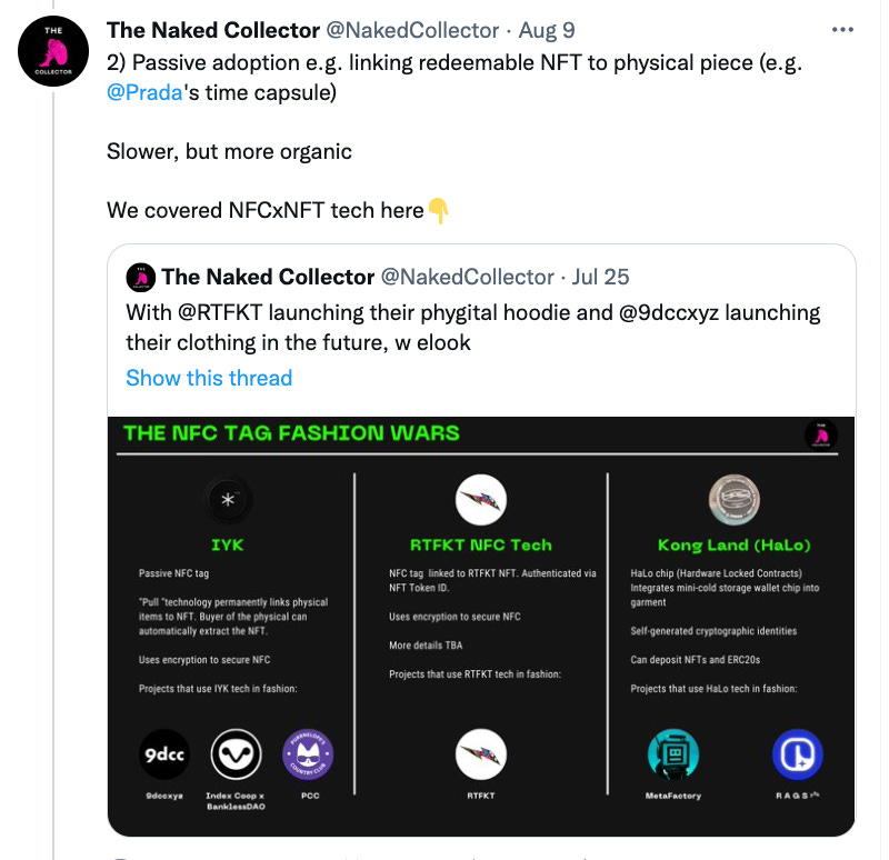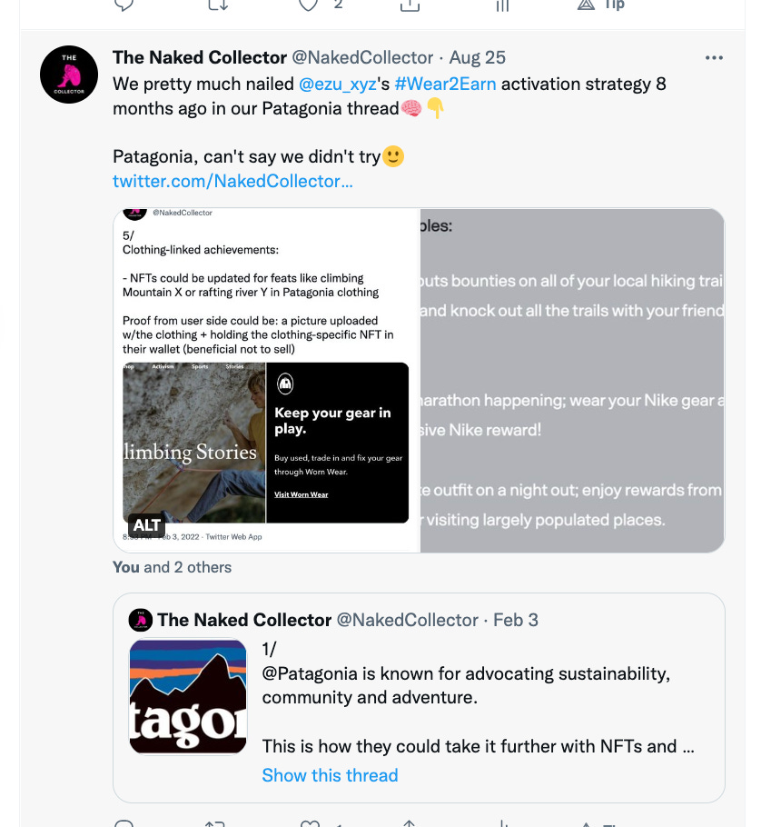(P.S Coincidence or not, EZU (a wear-to-earn project) is using the same activation strategy we proposed to Patagonia 8 months prior. Takeaway: you should read our alpha reports.)