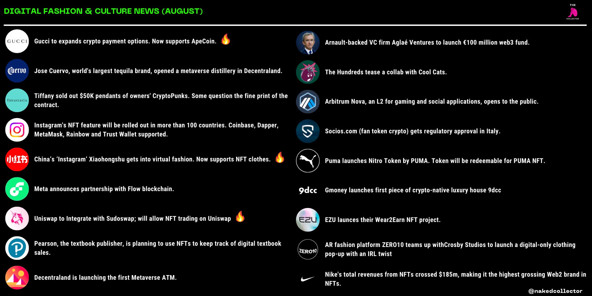 Gucci expands payment options, Tiffany sold out $50K CryptoPunks pendants, Meta partners with Flow blockchain, Nike crosses $185m in NFT revenues were just some of the fashion/culture headlines in August.