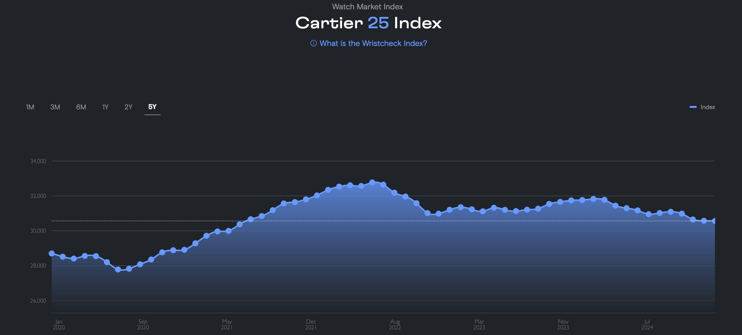 Watches as speculative assets: The post-2021 speculative boom in watches has deflated, with prices correcting across the board. Yet even here, there is divergence: iconic models like the Cartier Tank have held value far better than the broader watch index.