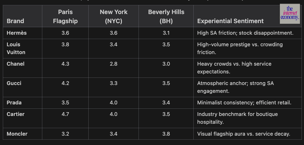 The boutique experience anchor: High-prestige flagships function as atmospheric anchors for the brand. Performance is driven by high-touch hospitality, including bespoke events, cultivated sales-associate relationships, and carefully choreographed in-store experiences. This establishes a sentiment floor that sustains loyalty among top clients even when other touchpoints underperform.