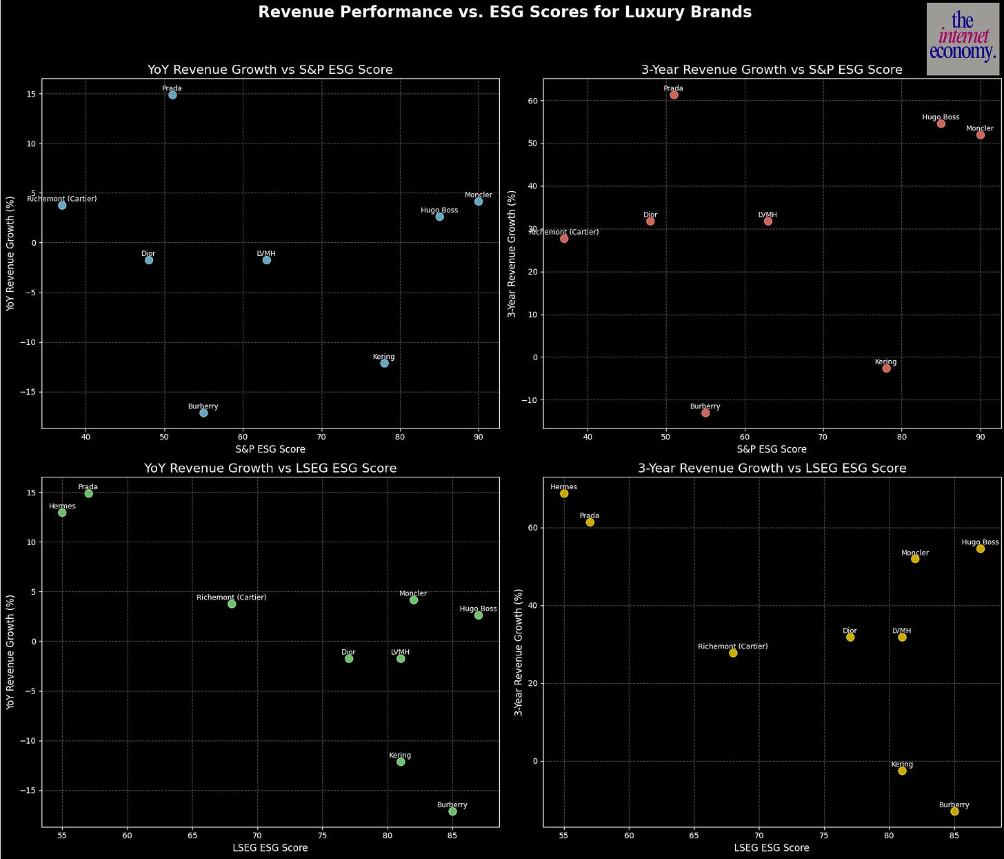 The market data tells a similar story. Across major listed luxury names, there is no meaningful positive correlation between ESG scores and either revenue growth or share‑price performance; when you plot LSEG and S&P ESG scores against 1‑ and 3‑year returns, you see something closer to the opposite, with lower‑scoring ESG names often outperforming over three years. Hermès, Prada and Richemont, three of the strongest stock and revenue performers of the last few years, sit near the bottom of the ESG rankings table in 2025.