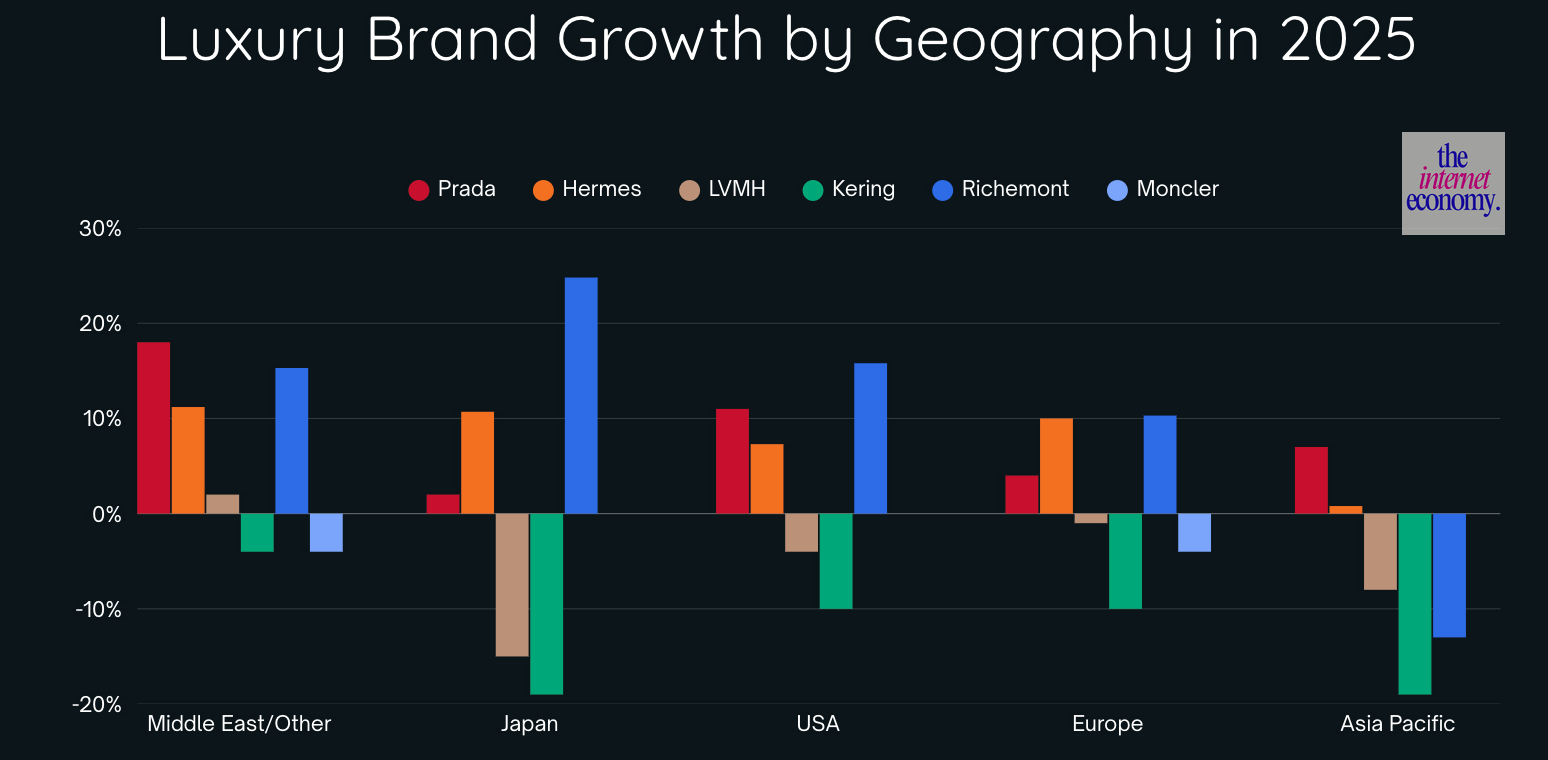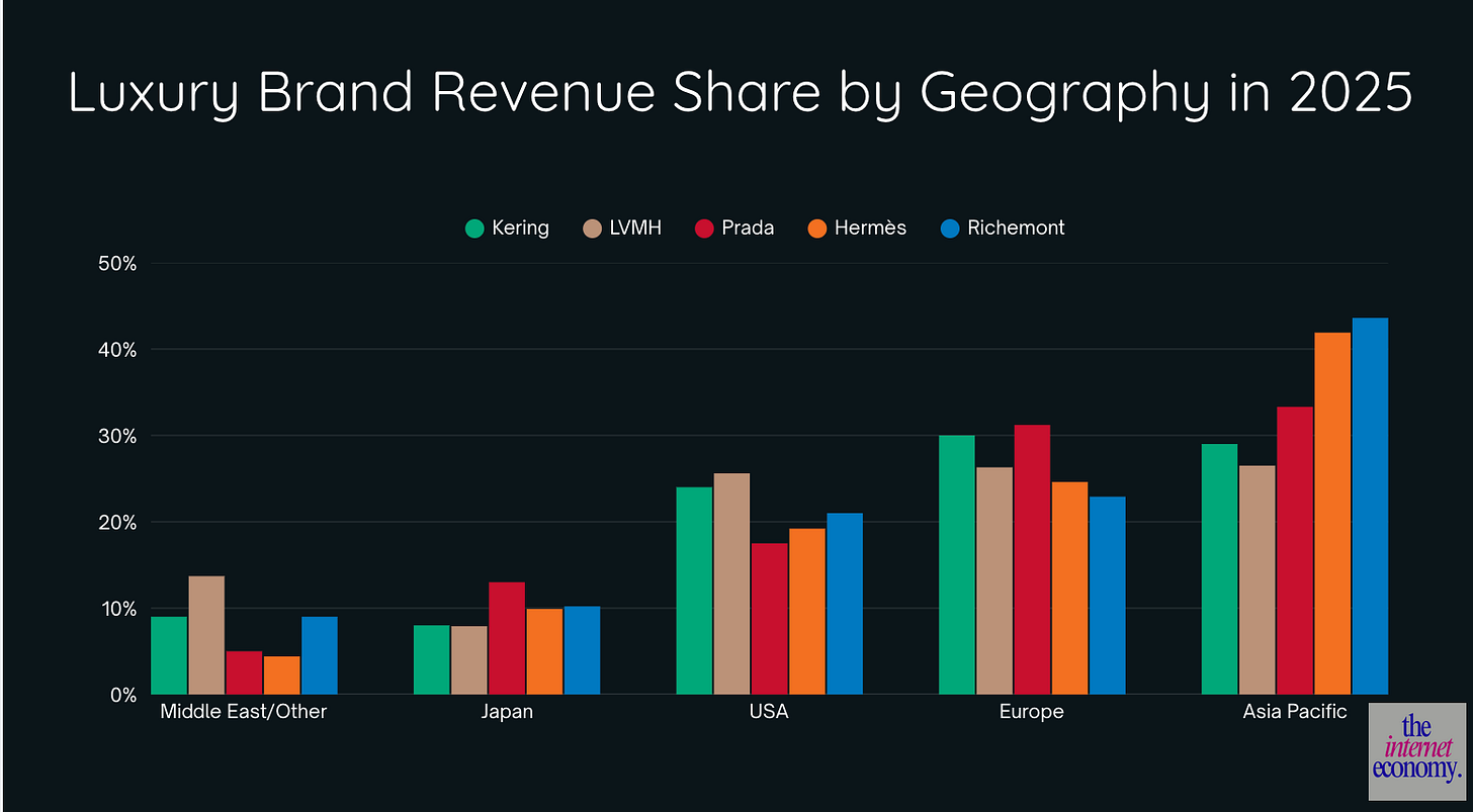 The common narrative of over-reliance on Asia-Pacific is false. In fact, two of the biggest growers this year (Hermès and Richemont) derive the majority of their revenue from that region, roughly 10 percentage points more than their peers.