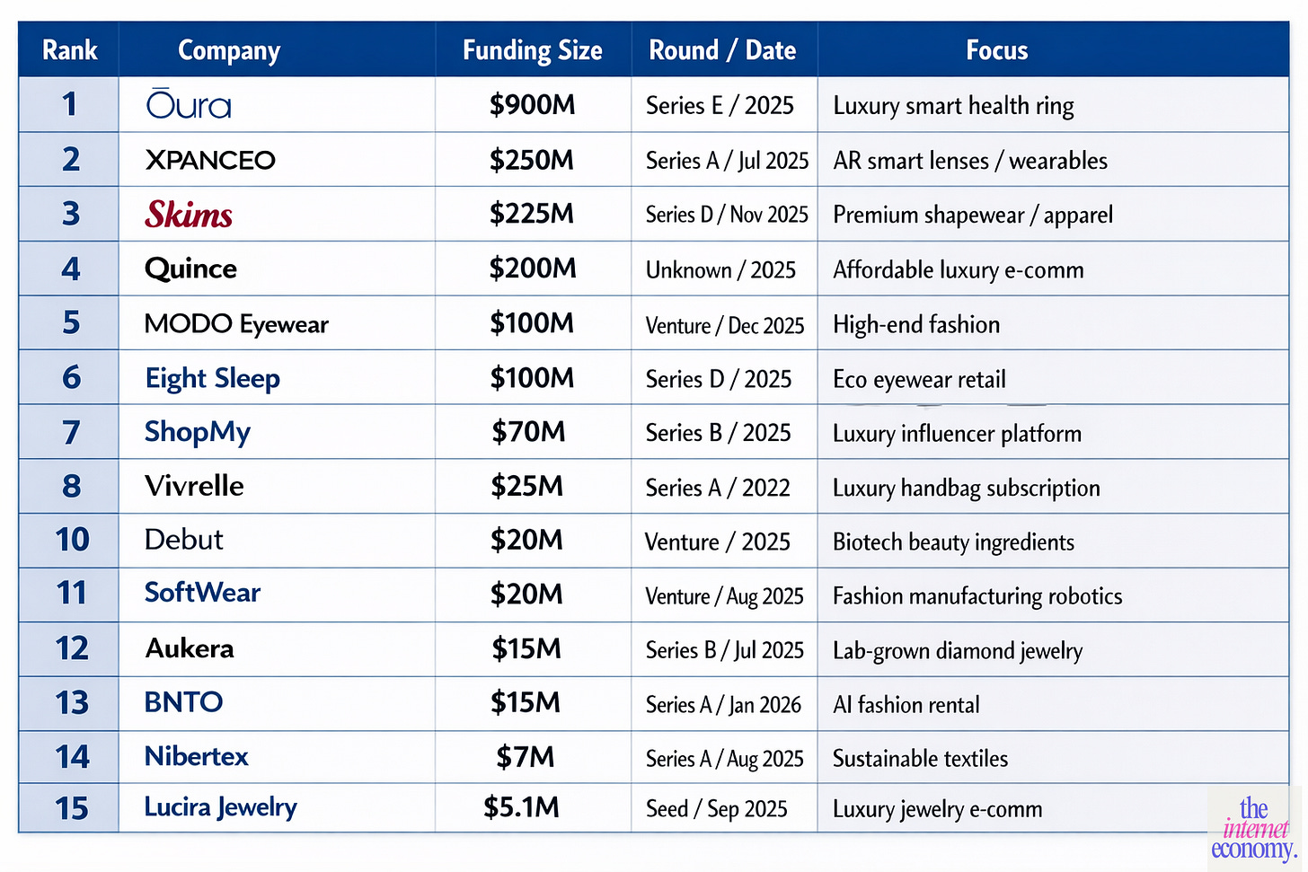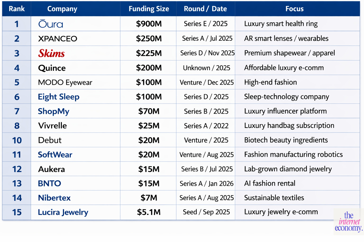 Funding flows suggest where AI’s impact will show up first, in infrastructure around luxury rather than in the maisons themselves. Oura, XPANCEO, Eight Sleep, SoftWear, BNTO and Nibertex sit in health data, AR lenses, sleep optimization, robotics, AI‑enabled rental and advanced textiles, and have raised far larger rounds than pure “luxury content” startups, underscoring that the early value is in materials, supply chain and data pipes rather than campaigns. If conglomerates do not build or partner into this stack, these intermediaries will own the customer insight and the AI‑driven margin upside. LVMH’s own 2025 Innovation Award slate points in the same direction: the highlighted startups cluster in AI and data intelligence (Kahoona, OMI), sustainability and circularity (Genesis, Aectual), and supply‑chain and media infrastructure (Authena, Ircam Amplify), not front‑end storytelling tools.