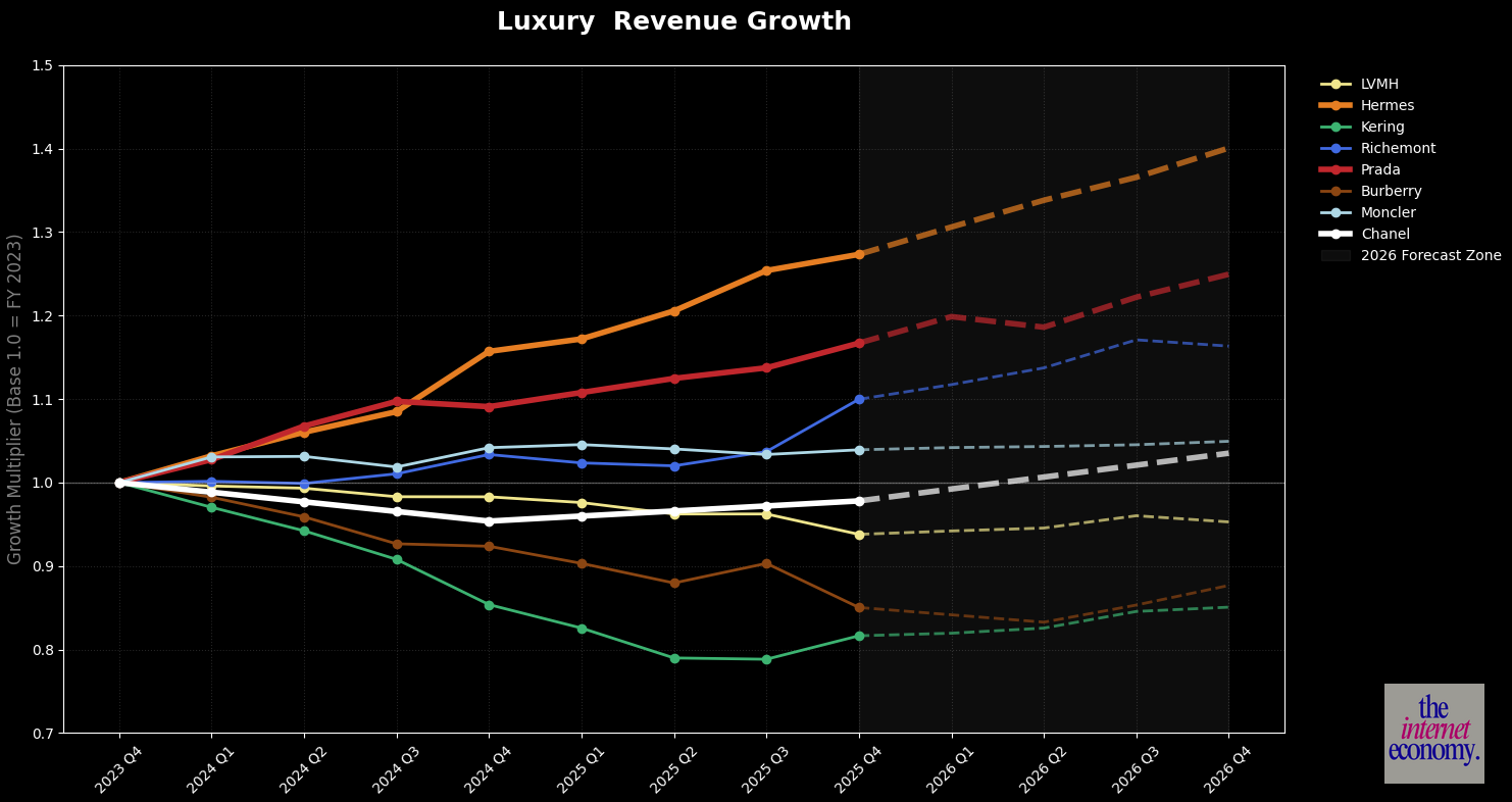 Revenue growth tells the more interesting story. LVMH is slowing, while Hermès and Richemont continue to grow. Prada and Moncler follow. For the rest of the major houses, growth has decelerated sharply and, in many cases, turned negative.