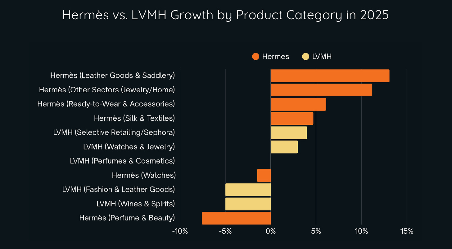 Given constrained production capacity, its main revenue lever, price, inherently has limits; beyond a certain point, customers may shift to other houses or adjacent categories. Growth has also been uneven across newer segments, for example, categories like watches have seen more modest traction, in part because Hermès is still primarily known for its leather goods.
