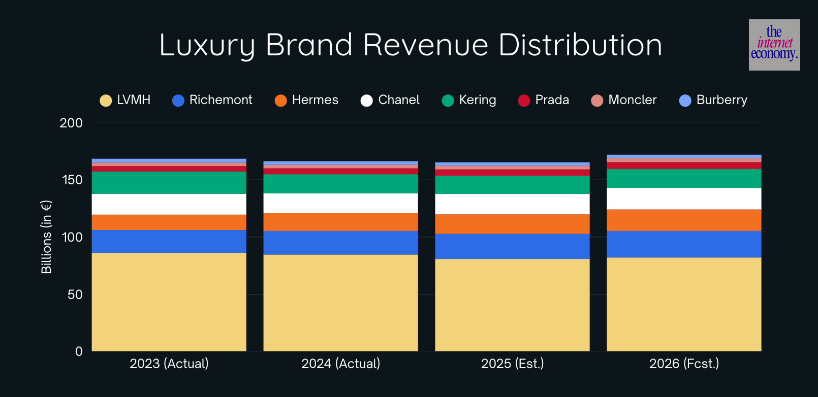 In terms of scale, LVMH still dominates, accounting for roughly half of the large-cap luxury group universe by revenue. Kering, Chanel, Hermès, and Richemont each sit at around 20–25% of LVMH’s size.