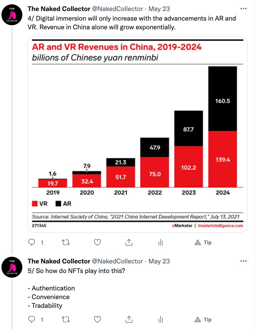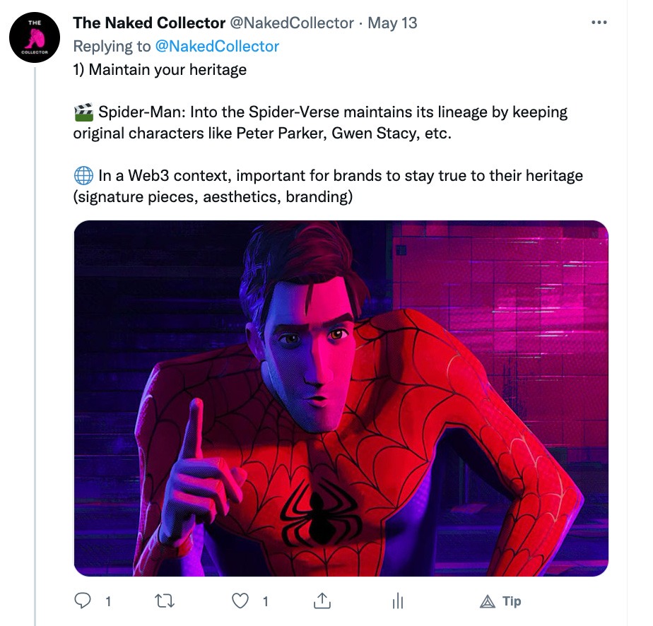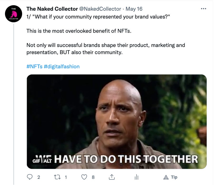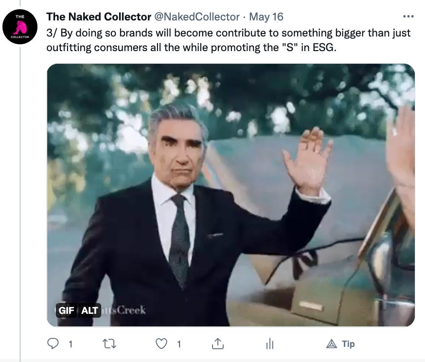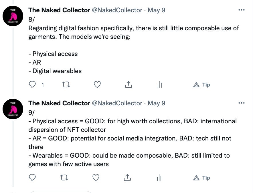 As you can see we are still in the infancy stage of fashion NFTs. Brands are dabbling in web3 trying to find themselves in the new arena. There are no right answers or established ways of operating. We try to inform and educate the web3 community and brands via our content. For more content like this follow us on Substack and Twitter @NakedCollector.