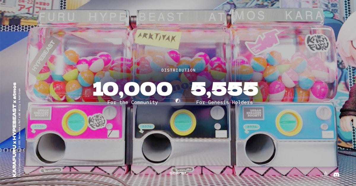 The Karafuru NFT project released 15,555 new NFTs called Karafuru Gachapon in collaboration with Hypbeast and atmos (a prominent Japanese streetwear and sneaker boutique). The collection gets you access to 3D Karafuru NFTs and will likely feature a phygical concept. The public mint price was 0.475ETH and is currently trading at 0.22ETH.