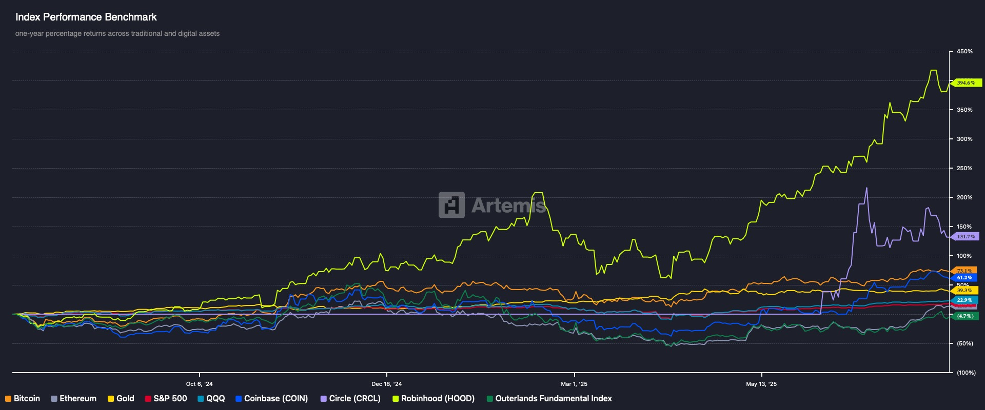 Stocks have also become a way to invest in crypto innovation, as more and more crypto companies list there first. Ironically, the most pure-play stablecoin investment, Circle, was first available for stock market, not crypto, investors. Coinbase and Robinhood are also investable. In fact, Robinhood has been among the best-performing TradFi plays this cycle.