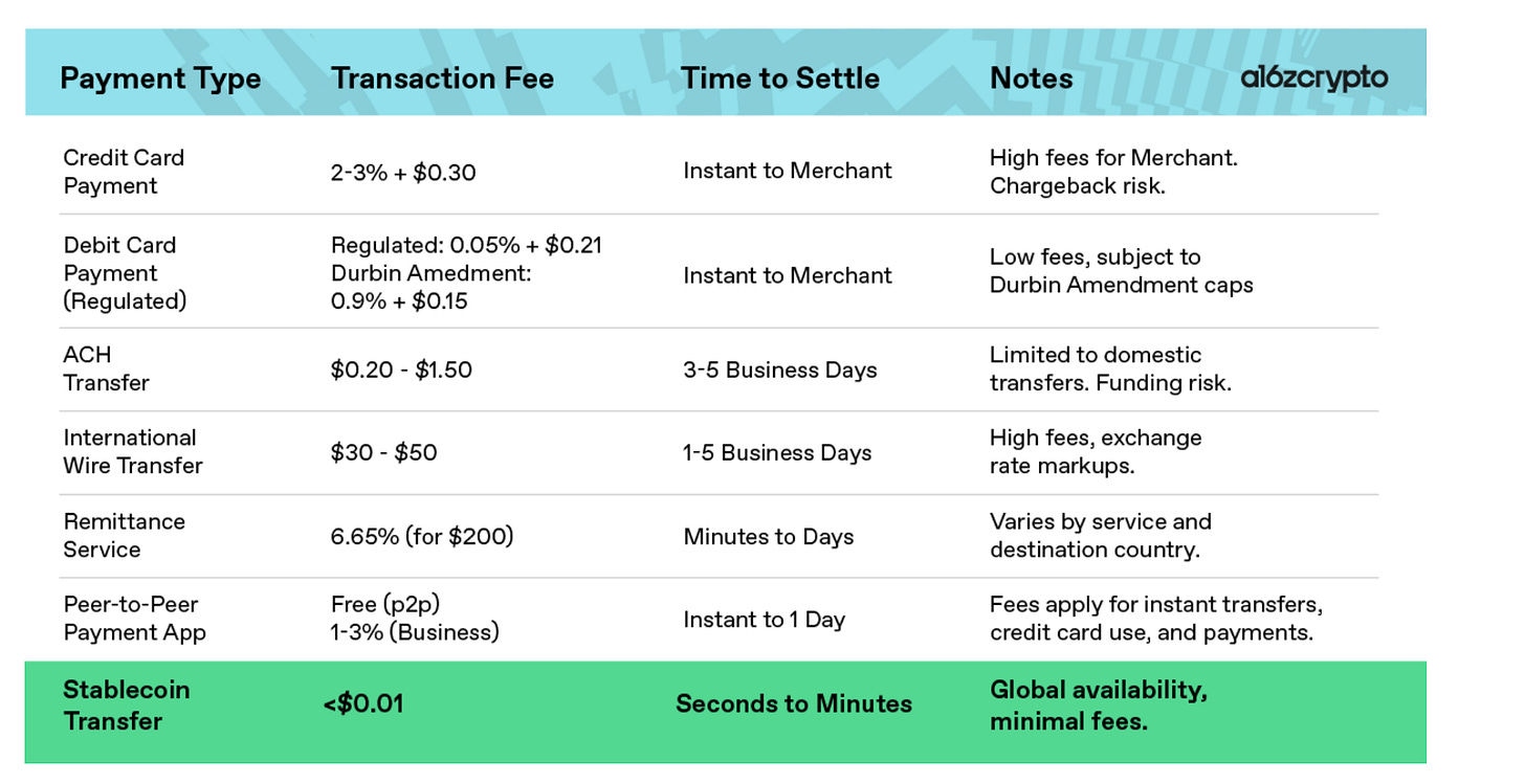 a16z made calculations of how much merchants save by shifting to stablecoin rails, especially in the US where the interchange isn’t capped like it is in Europe.