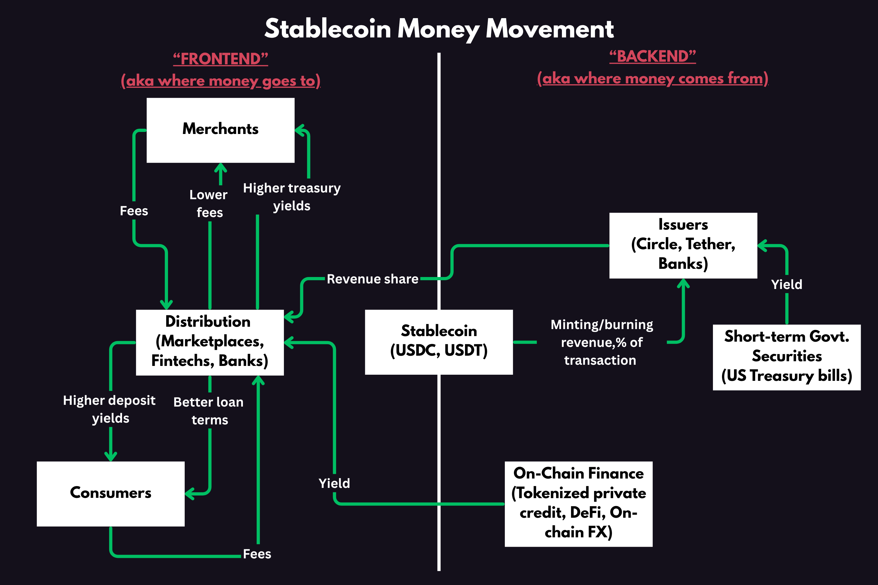 Recently, a bank asked me, “who gets the money” in stablecoins. The answer to this is multi-sided. Below is a simplified visualization on how the money flows and where it comes from in the stablecoin ecosystem.