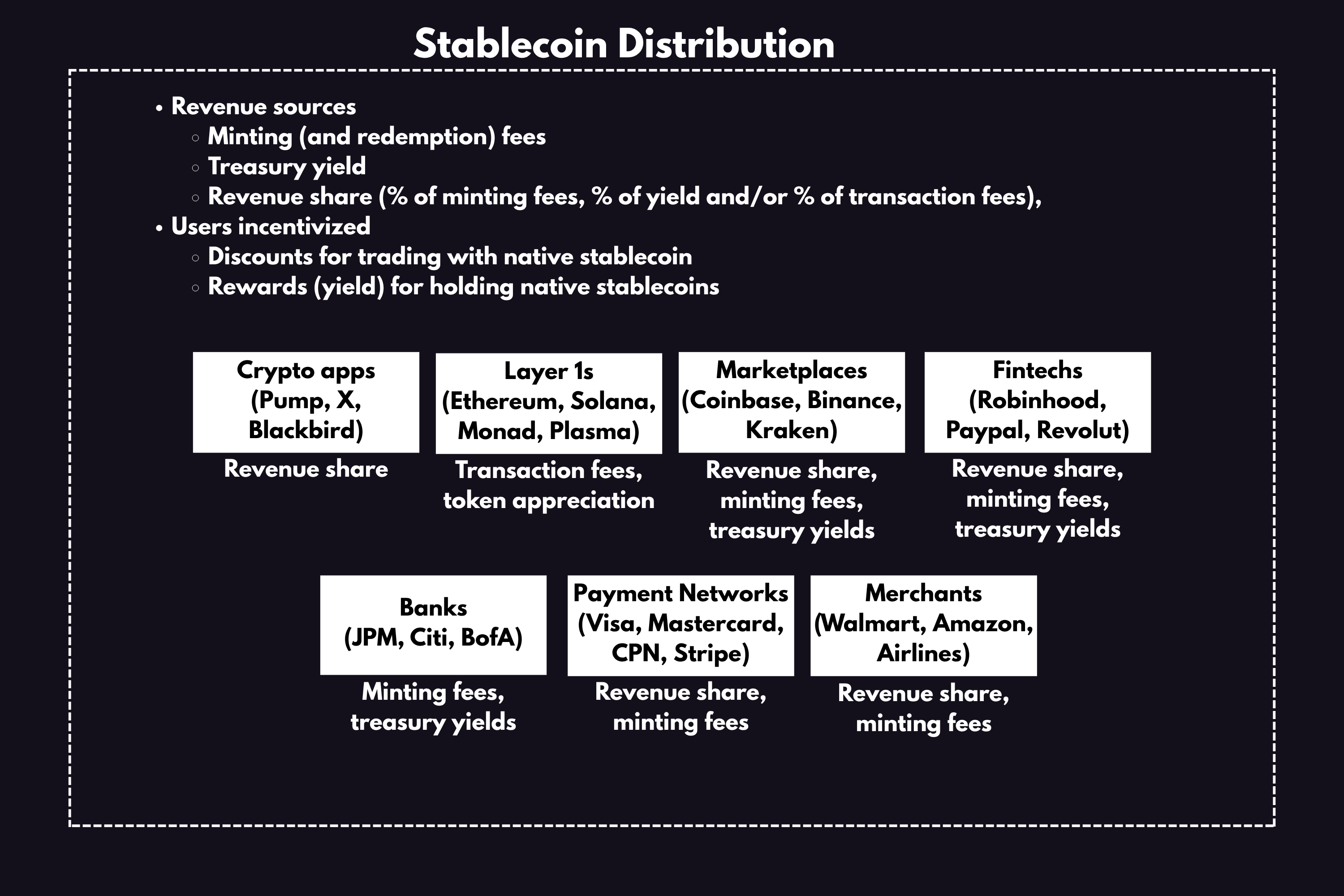 I’ve created a visual categorization of stablecoin distributors below. These include: crypto apps, Layer 1s, Marketplaces, Fintechs, Banks, Payment Networks, and Merchants. While value accrual will happen at the distribution layer, there is increasing competition among them.