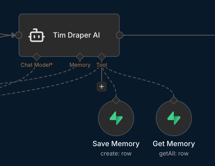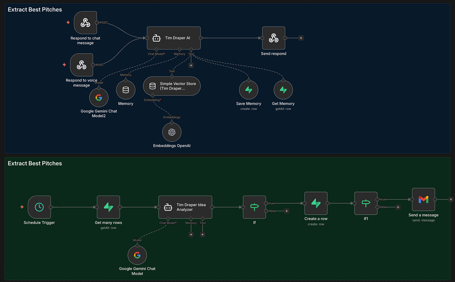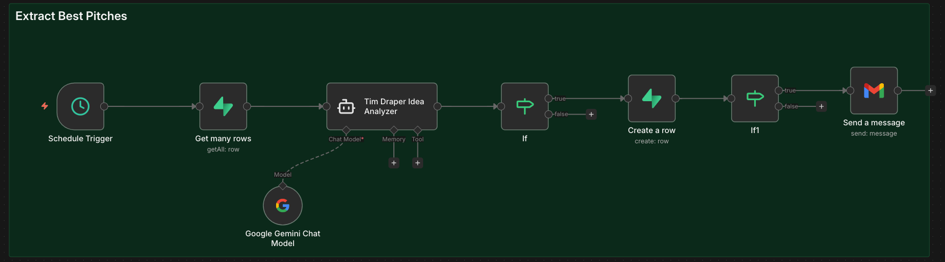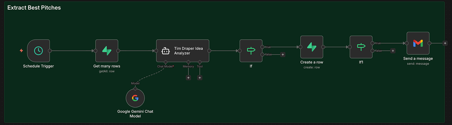 My simple “Extract Best Pitches” workflow runs on a schedule, pulls all conversation logs, analyzes them with a separate LLM, flags high-potential startups automatically, and updates the database. You could then send the approved ideas/pitches via Gmail or another email provider to Tim.