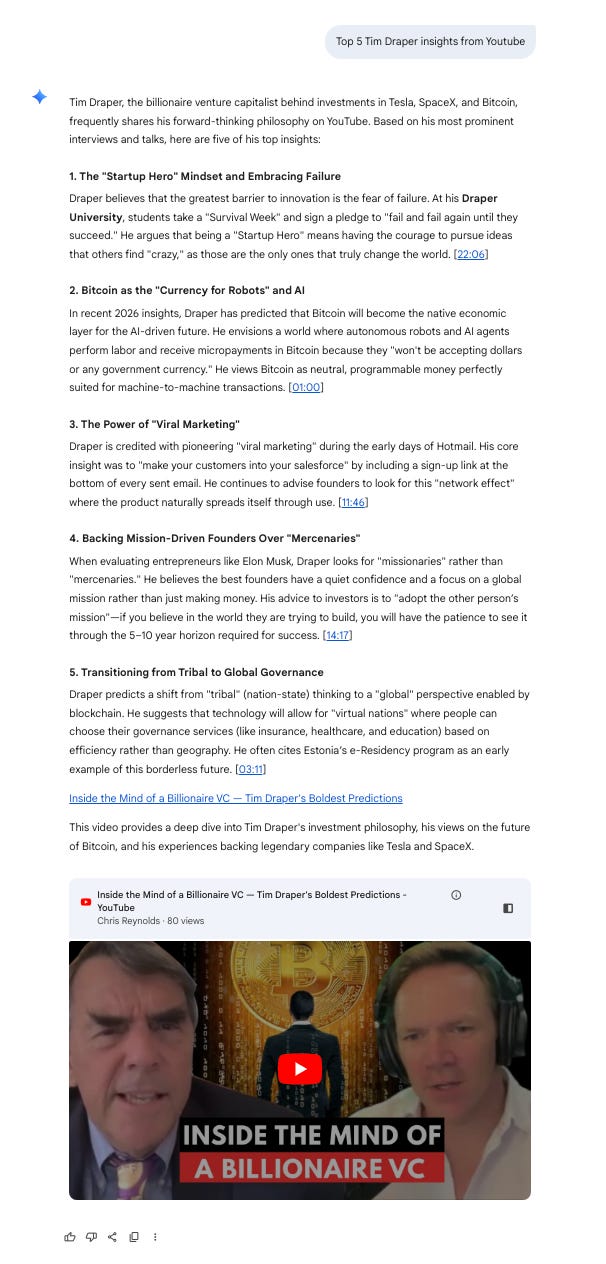 PRO TIP: It’s not always necessary to use RAG. If the knowledge base primarily contains publicly available information, for example via YouTube (if Tim Draper had a podcast which he consistently published on YouTube), you may not even have to create a RAG, as Google (which owns both Gemini and YouTube) already has a pretty great knowledge base as is.
