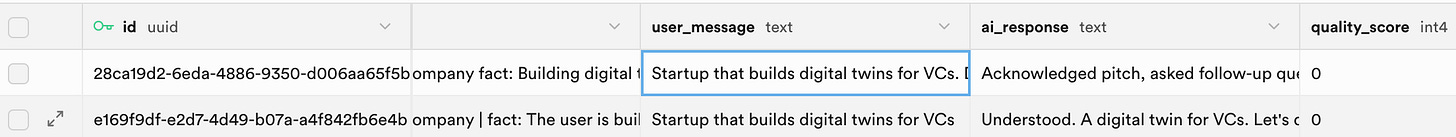 Proper data storage is critical for both the conversational experience and the qualification pipeline. Without structured storage, you can’t track conversation quality, extract insights, or automate pitch evaluation (or other actions based on user inputs).