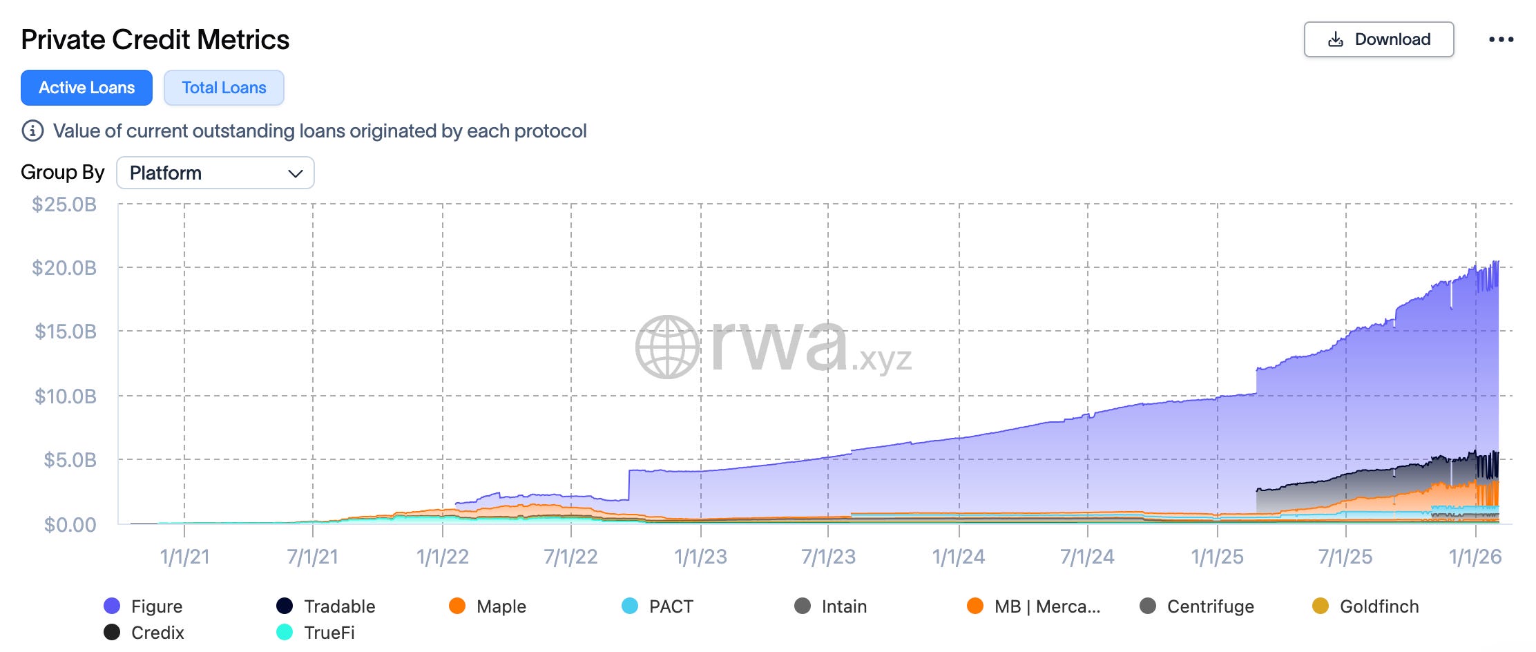 The largest on-chain credit operation today belongs to Figure Technologies, which operates on the Provenance Blockchain. Figure has tokenized assets such as HELOCs and other consumer loans, reaching close to $19 billion in total value originated, with roughly $15 billion active as of early 2026. The yield here comes from traditional private lending economics (credit spreads, borrower demand, and structured underwriting) now made accessible through tokenized rails.