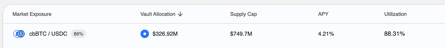 A useful example here is Gauntlet’s largest vault, USDC Prime on Base. The vault allocates nearly all of its assets to the cbBTC/USDC pool, lending out USDC against cbBTC collateral at roughly 4%.
