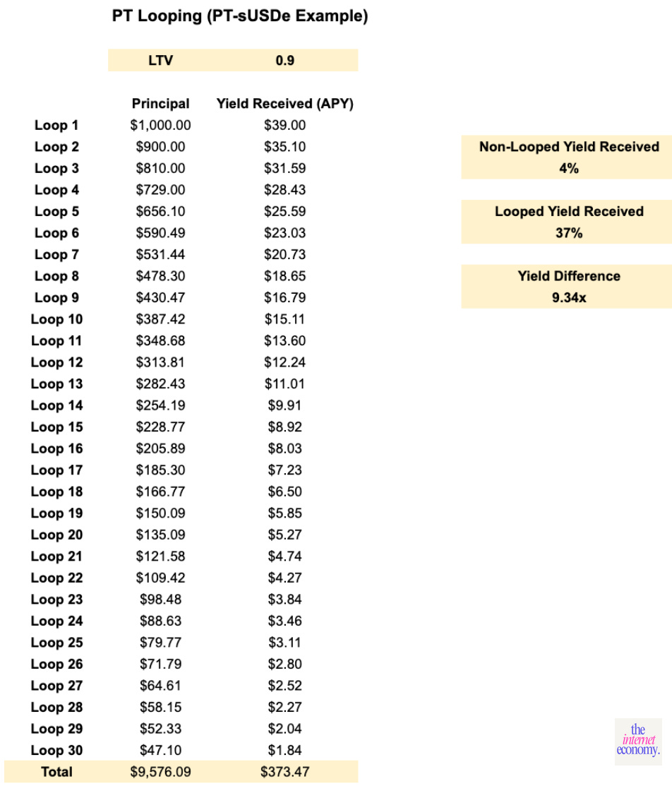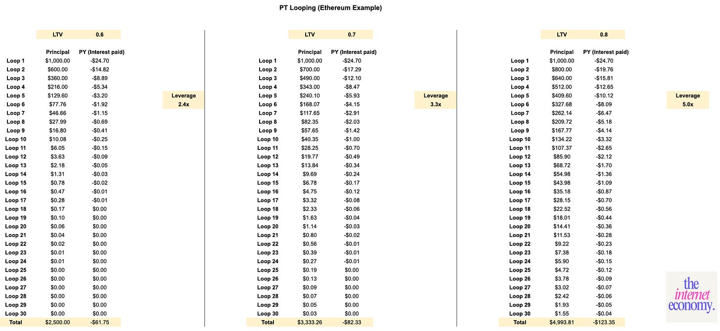 A more structurally interesting, and arguably safer, version of looping uses principal tokens (PTs) rather than volatile collateral.
