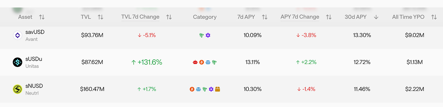 Looking at the highest-yielding stablecoins, a clear pattern emerges. Names like Avant, Unitas, and Neutrl consistently sit near the top of the yield rankings.