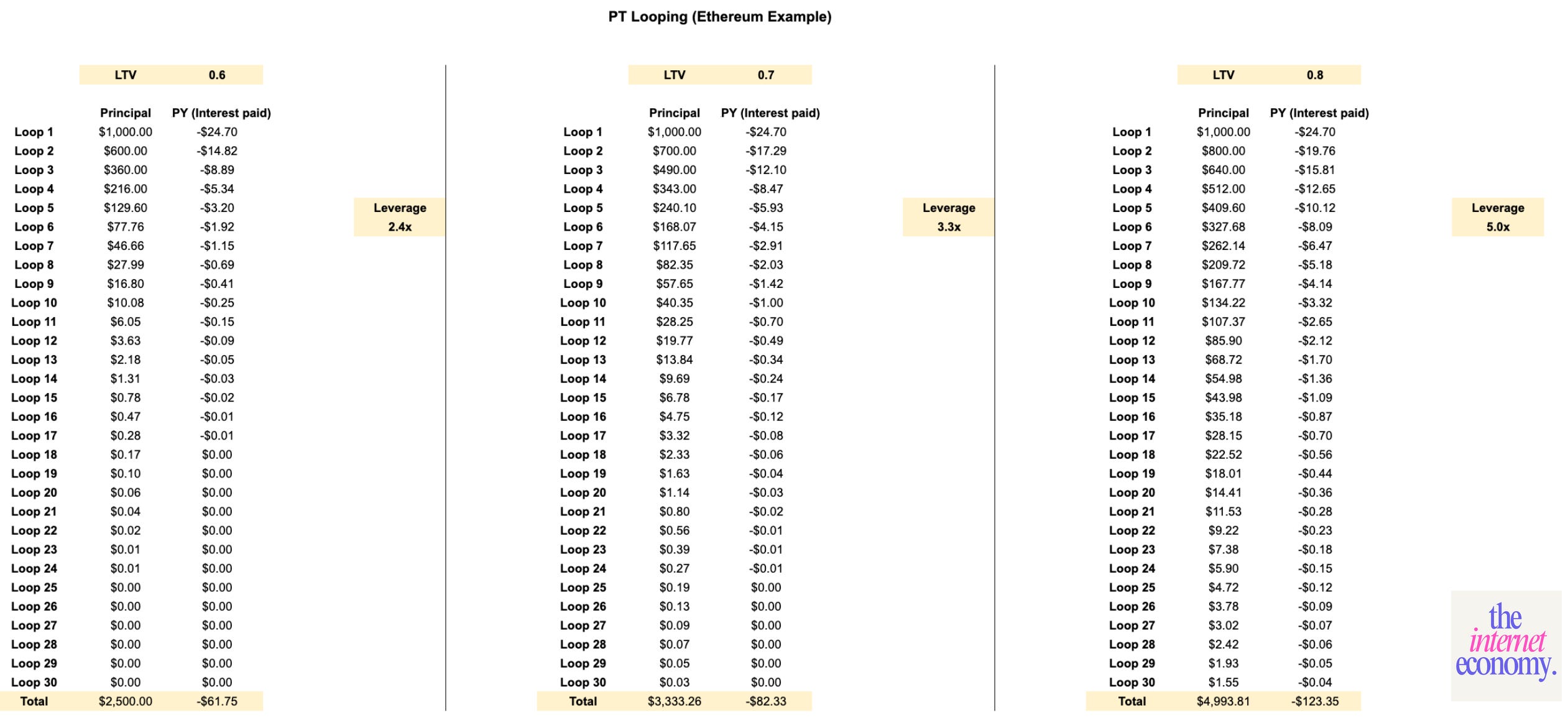 As you can see in the math below, each loop increases effective leverage, with the final leverage ratio determined by the LTV cap and the number of iterations.